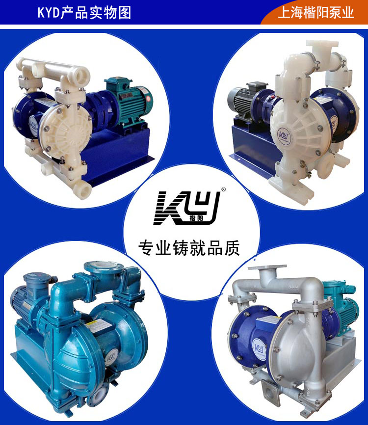KYD電動隔膜泵是上海楷陽電動隔膜泵廠家開發的最新一代電動隔膜泵型號,整機由西門子貝德電機(也可定做其他品牌電機)、擺針式減速機、聯軸器、泵頭和底座組成。KYD電動隔膜泵流量范圍在0.15至36立方米每小時,出口壓力最大可達6公斤;電動隔膜泵型號可做鑄鋼、鋁合金、聚丙烯、氟塑料、不銹鋼、鋼襯氟材質,滿足了化工、醫藥、水處理、食品、機械、煤礦、石油、船舶、冶金、陶瓷等行業的不同要求。并且有可空轉、可通過纖維顆粒物、可調速、可不加引水自吸、無軸封等其它泵不具備的優勢,受到各行業一致好評。