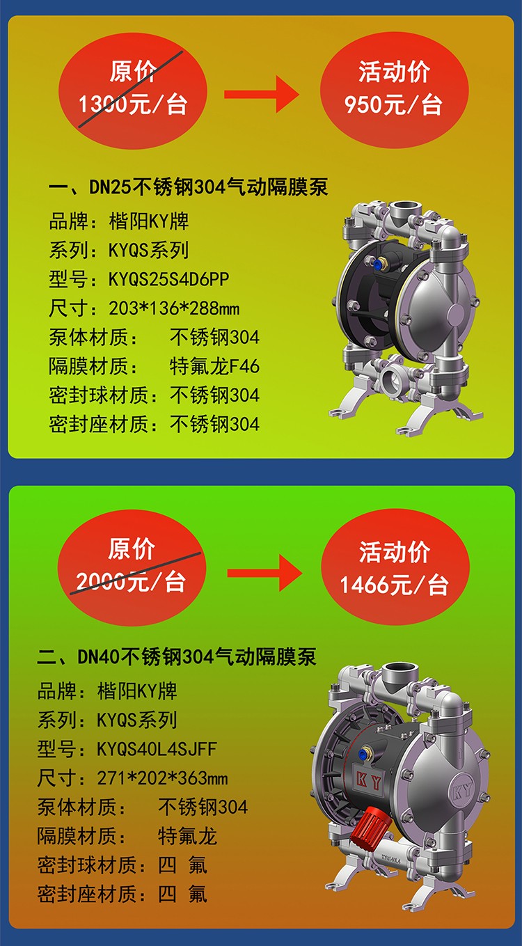 本期活動為楷陽氣動隔膜泵四大系列中的KYQS輕巧靈便系列產(chǎn)品,九大材質(zhì)中的不銹鋼304和鋁合金材質(zhì)產(chǎn)品,詳情請仔細閱讀以下細則:
