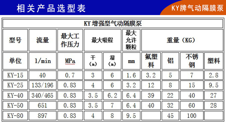 4)、如果輸送介質工況比較惡劣,含強酸強堿且穩定比較高,可以選用楷陽鋼襯氟隔膜泵和全PVDF氟塑料氣動隔膜泵。