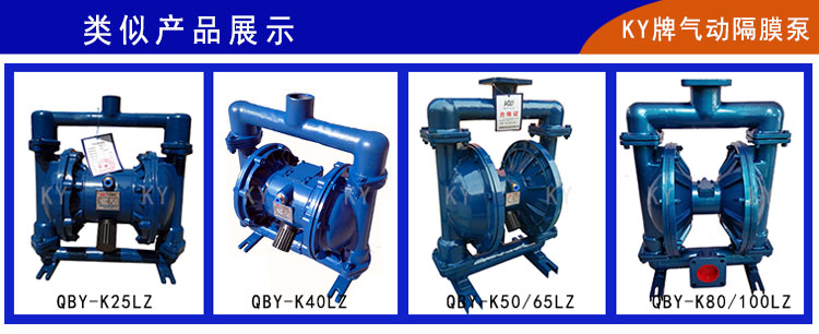 本頁面是由上海楷樣泵業為您提供的QBY-K25鑄鐵氣動隔膜泵型號、圖片等信息在此有大量QBY-K25鑄鐵氣動隔膜泵信息供您選擇。本廠有強的設計,生產、銷售和服務隊伍,質量體系完善,測試齊全,生產工藝先進,確保產品質量有保障免客戶后顧之憂。 如果您有興趣或想了解價格請通過底部的聯系方式與QBY-K25鑄鐵氣動隔膜泵生產廠家聯系。